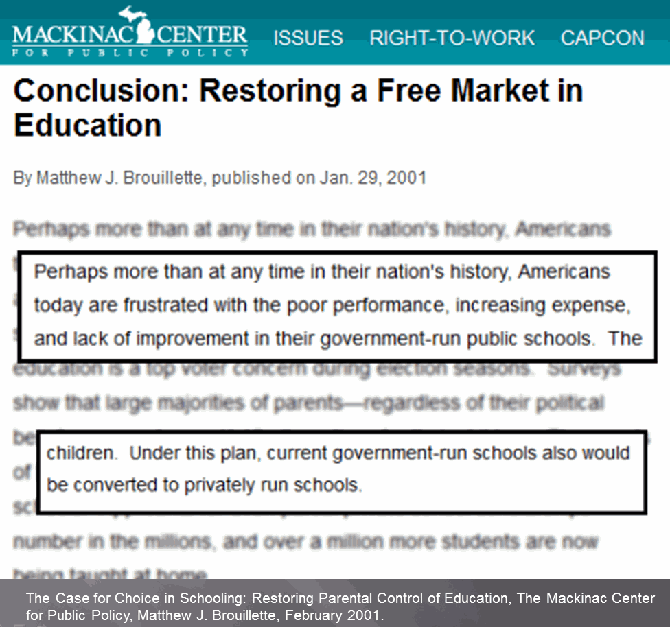 • The Mackinac Center bills itself as an independent think tank, but it’s actually funded by corporations that want part of the $14 billion public schools budget.