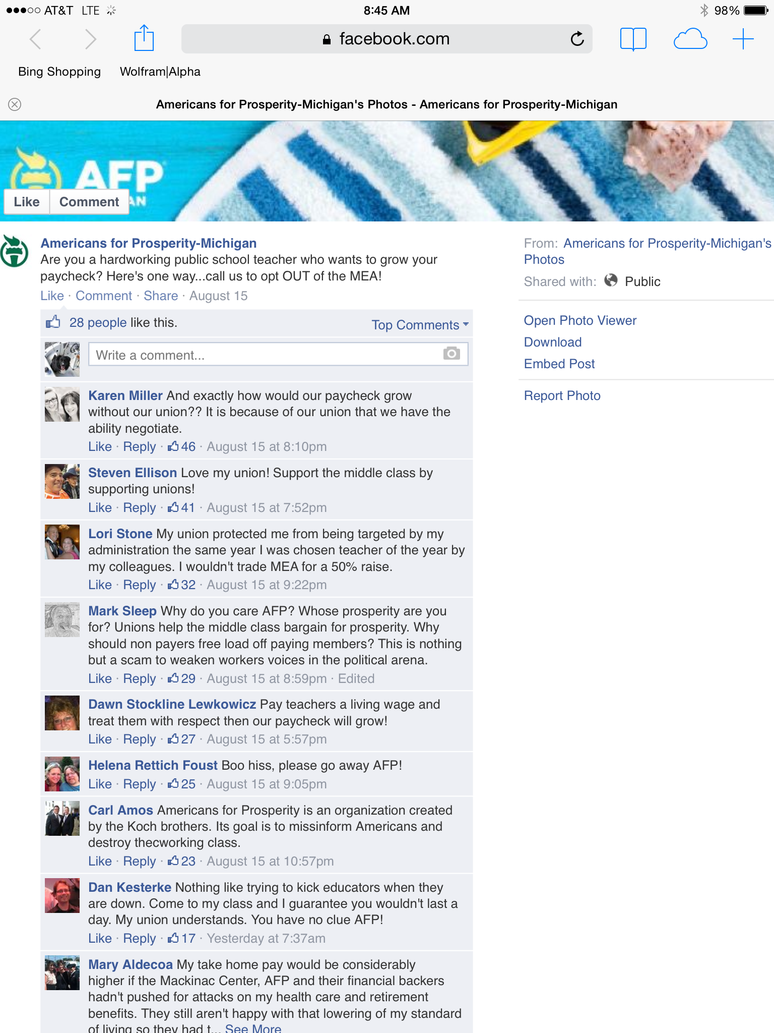 The Koch Brother front group Americans for Prosperity recently added a “Take a vacay from the MEA” post to its FaceBook page. Members were not pleased.