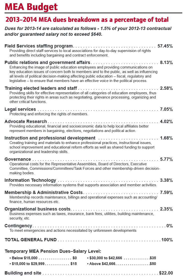 The chart below (available in the back of the MEA calendar) shows a more reliable breakdown. Keep in mind that representation includes more than the first category: UNISERV directors give and receive training, nearly all of legal spending is related to UNISERV work, etc.