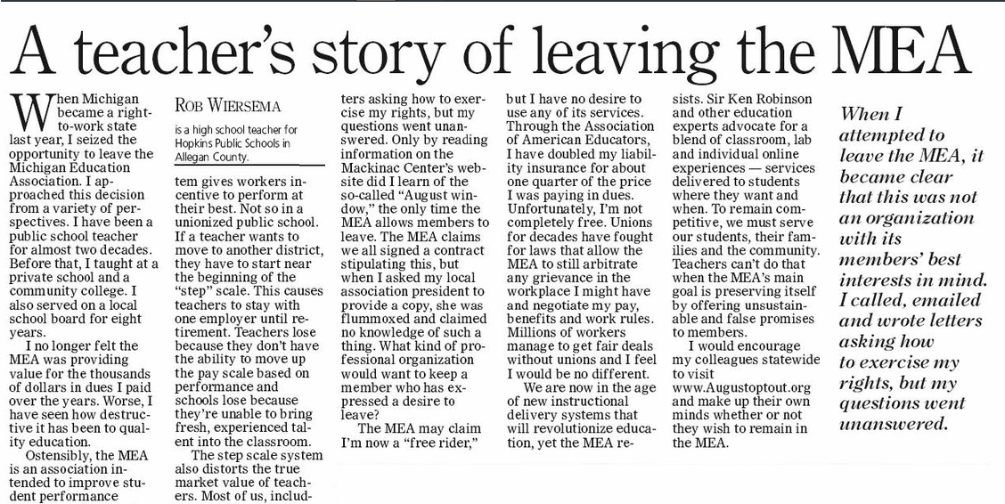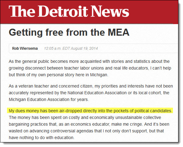 But they and their surrogates continue to tell this knowing lie. Most recently in an Detroit News Op Ed, Getting free from the MEA, written by Allegan County teacher Rob Wiersema: